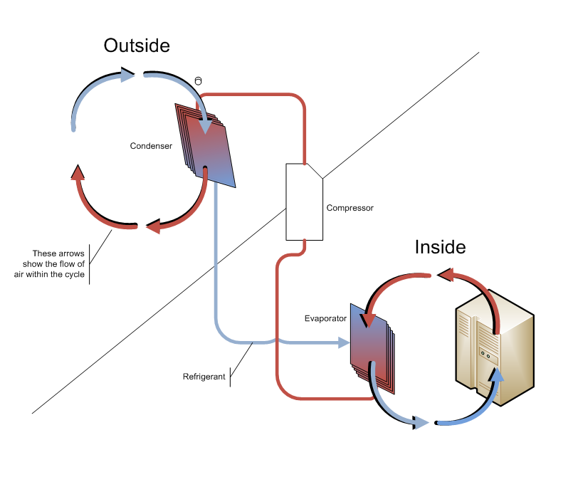 Now that the heat was removed from the server room and passed to the refrigerant, it must go somewhere and that is where the compressor comes in. Warm liquid refrigerant is compressed into a hot gas and this compression of refrigerant forces it to travel to the condenser where the heat is absorbed into the outside air. This allows the cooled refrigerant to condense and return to the evaporator to start the process all over again. And again, this part of the cycle is accomplished different ways depending on the type of equipment installed.
