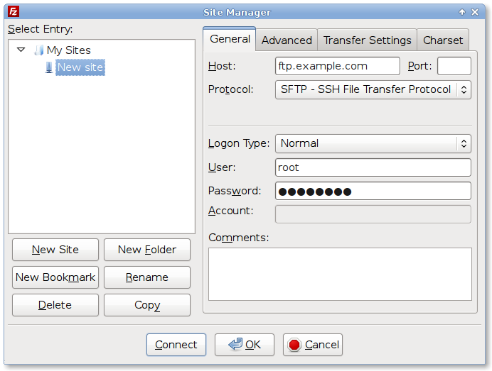Enter an IP address or domain name for your server in the Host field, and select "SFTP" as your protocol. You'll enter the root user's login information, and you're ready to connect by clicking the "Connect" button or you can click the "OK" button to save and close the dialog box.