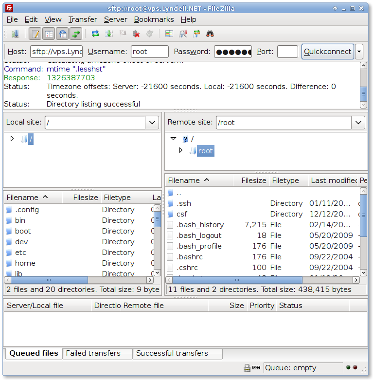Status: Connecting to server.example.com... Response: fzSftp started Command: open "root@server.example.com" 22 Command: Trust new Hostkey: Once Command: Pass: ********** Status: Connected to server.example.com Status: Retrieving directory listing... Command: pwd Response: Current directory is: "/root" Command: ls Status: Listing directory /root Status: Calculating timezone offset of server... Command: mtime ".lesshst" Response: 1326387703 Status: Timezone offsets: Server: -21600 seconds. Local: -21600 seconds. Difference: 0 seconds. Status: Directory listing successful