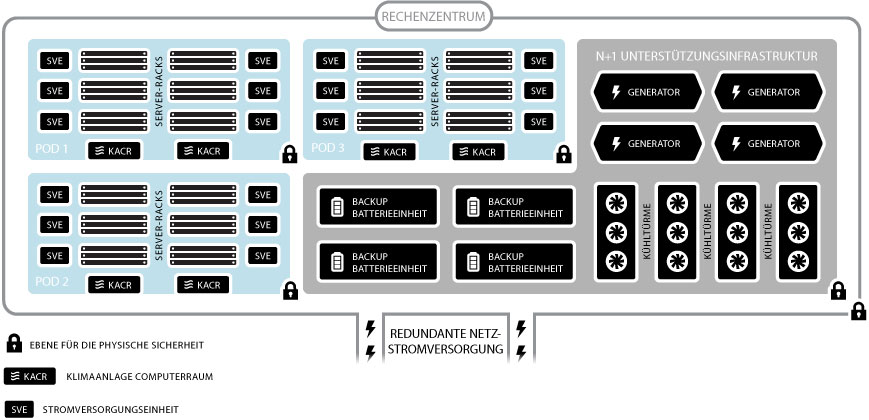 Jedes Rechenzentrum verfügt über einen oder mehrere PODs (Point of Delivery, Bereitstellungspunkt), die alle gemäß denselben Spezifikationen mit leistungsfähigen Verfahren zur Unterstützung von bis zu 5.000 Servern erstellt werden. Durch diese Standardisierung an allen Standorten werden wichtige Leistungsvariablen des Rechenzentrums optimiert, einschließlich Kapazität, Strom, Netzwerk, Personal und interne Infrastruktur.