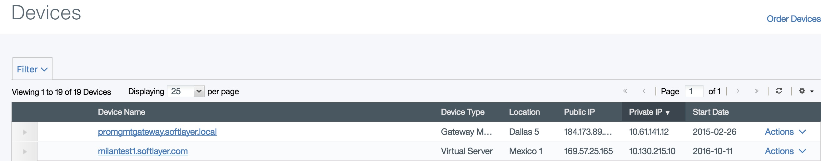 The Device List is the central location for device management associated with your SoftLayer customer account. Upon accessing the Device List, Bare Metal Servers are indicated with the Device Type of Server, while Virtual Servers have a device type of Virtual. Many interactions available for both devices are similar; however, each type of device will also have a handful of device-specific interactions. The Device List also displays the location of your device, the device name, and when the device was first provisioned by default. Use the Settings Cog to update the Device List to your desired view.