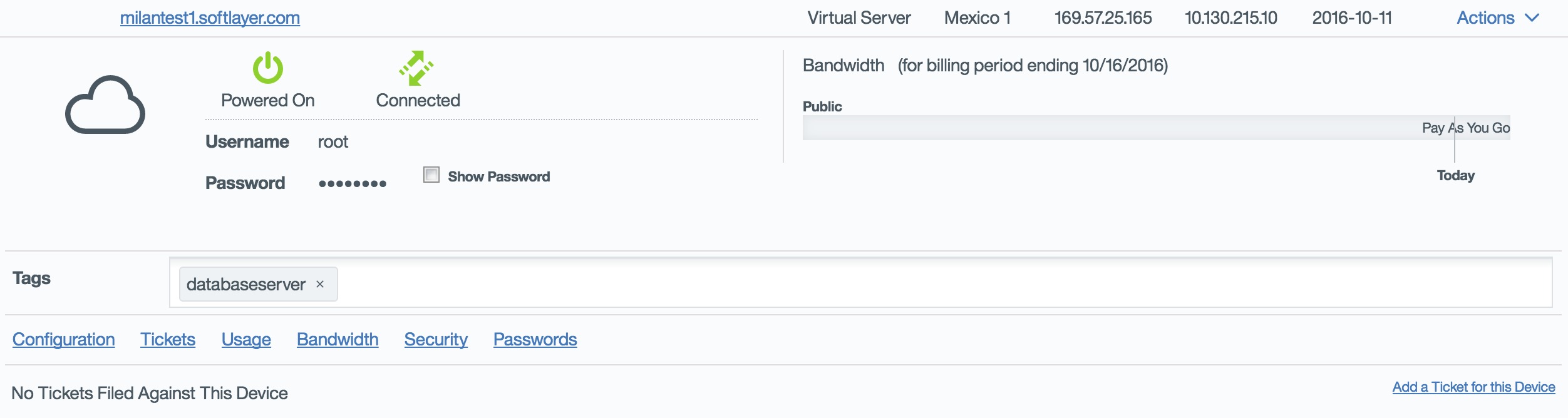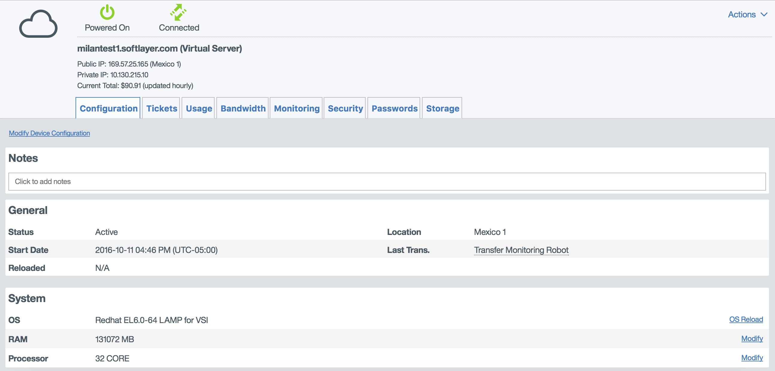 Click on any device name within the Device List to gain access to your device through the Device View. Within the Device View, you have the ability to view and manage the information on any of the tabs present. Available interactions may vary between Virtual Servers based on how they have been configured and will also vary between Virtual Servers and Bare Metal Servers. The image below displays the Device View for a sample Virtual Servers.