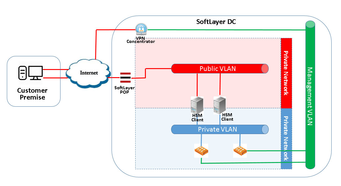 To connect to the Hardware Security Module (HSM) VPN to your customer account or connect from a server on your account that has connectivity to the private VLAN on which the HSM was provisioned. See figure 1 below on connectivity.